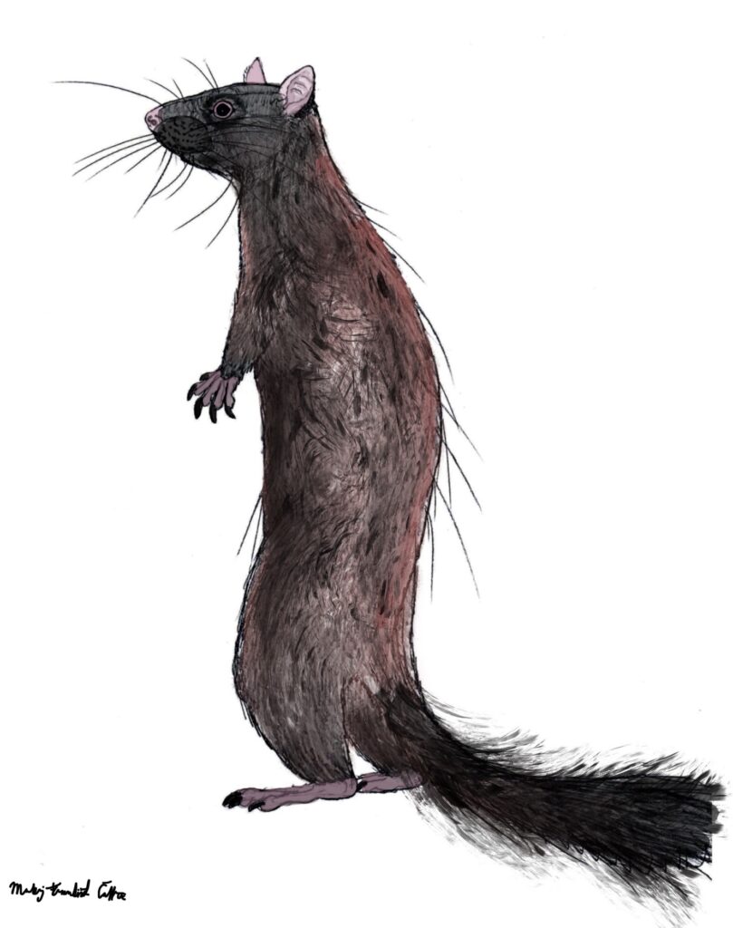 My life reconstruction of Masrasector nananubis, an Egyptian, Late Eocene (Priabonian, ~34 Ma) teratodontine hyaenodont of the size of a mongoose (roughly 1 kg). As described by (Borths & Seiffert 2017), based on the morphology of the distal humerus, it was an agile, terrestrial predator.
