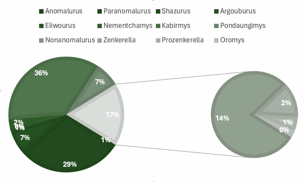 Pondaungimys anomaluropsis (Dawson et al. 2003) – Late Middle Eocene (approximately 40Ma); Paukkaung locus no. 2 (PK2) and Saba Pondaung (PK4 – Spg), Pondaung area, Central Myanmar (Coster et al. 2019), Bhl locality, Bahin area, Central Myanmar (Dawson et al. 2003); the solely recorded anomaluroid from Asia, the dentition similar to other nementchamyids, non-volant; in total, 15 specimens listed.