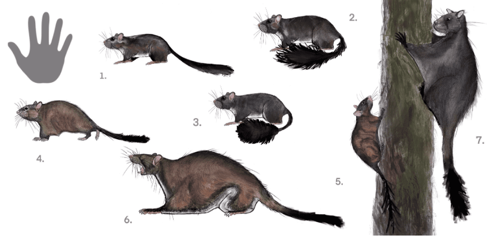A selection of fossil volant and zenkerellid anomaluroids drawn to scale (hand length equals 18 cm). 1. Oromys zenkerelliopsis; 2. Prozenkerella saharaensis; 3. Zenkerella wintoni; 4. Shazurus minutus; 5. Argouburus minutus; 6. Paranomalurus walkeri; 7. Paranomalurus bishopi. (drawn by Matej F. Čalfa)A selection of basal non-volant anomaluroids drawn to scale (hand lenght equals 18 cm). 1. Nonanomalurus soniae; 2. Kabirmys qarunensis. (drawn by Matej F. Čalfa)