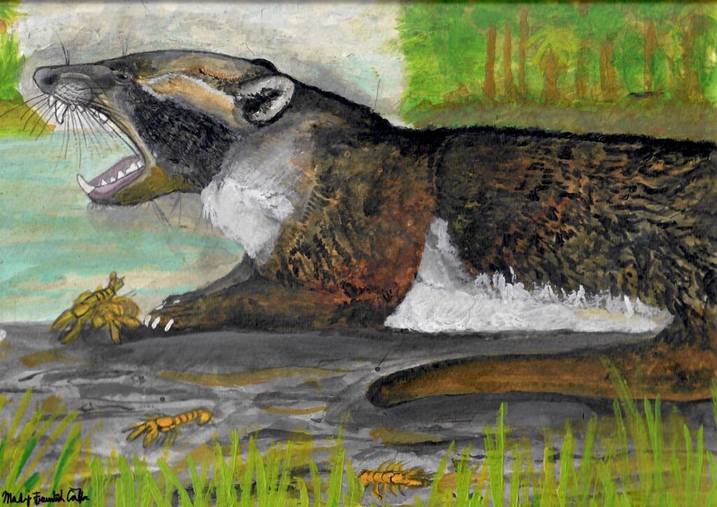 Here I present my life reconstruction of Apterodon langebadreae, a semiaquatic hyainailourid hyaenodont of Middle Eocene Libya. As described by (Grohé et al. 2012), based on the limb morphology, this species possessed pronounced adaptations for digging as well as swimming. Moreover, like all the other members of Hyainailouridae, Apterodon had a proportionally massive head and different body proportions compared to modern carnivorans. In the reconstruction, it is depicted at the edge of a riverbank, accompanied by a few crustaceans as potential prey.